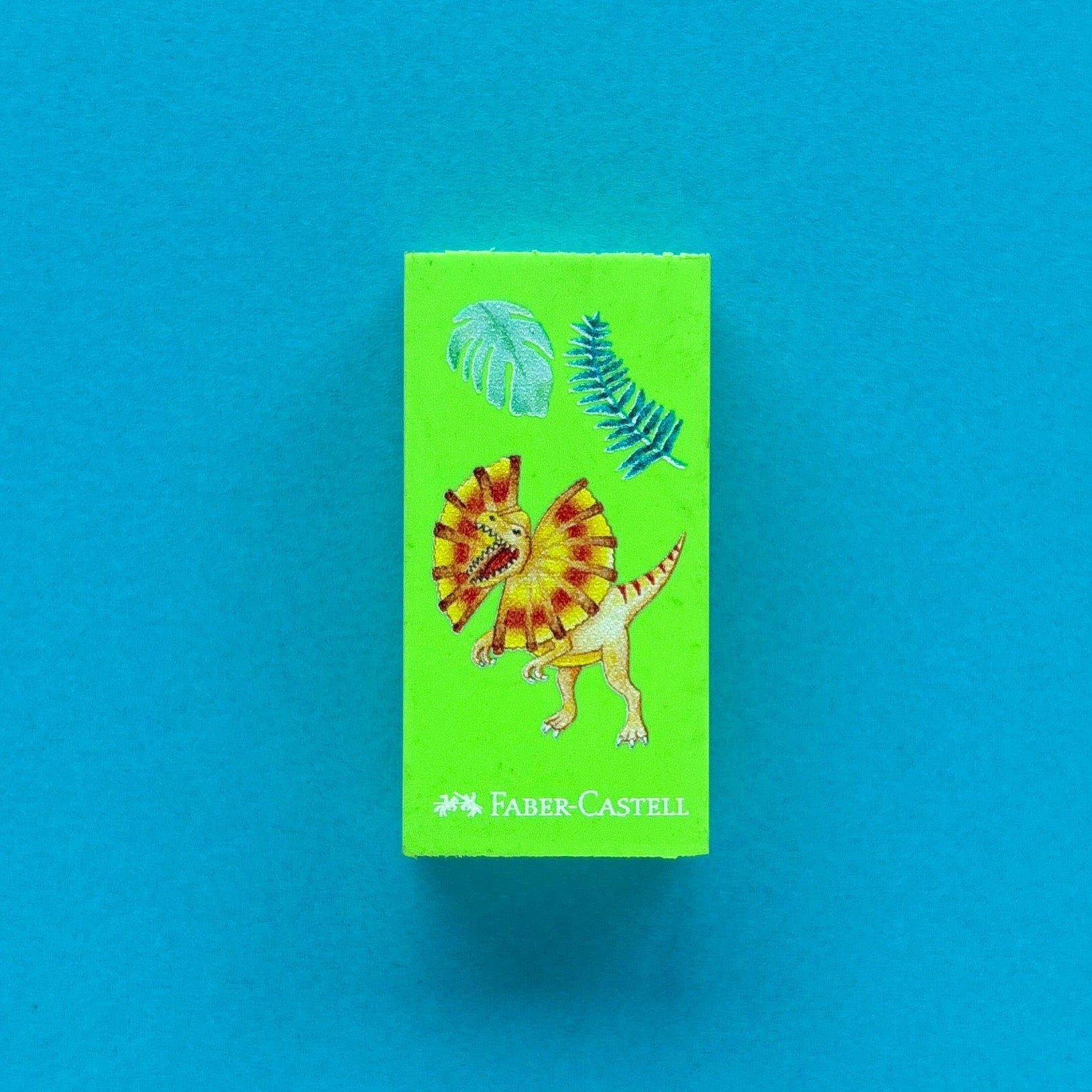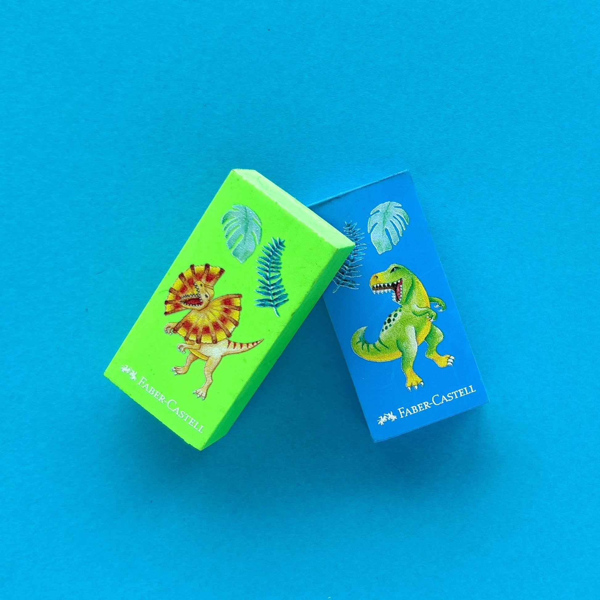 Su forma rectangular es fácil de manejar y está pensado para borrar lápiz de grafito de manera segura. Disponible en color azul o verde, con ilustración de Tiranosaurio Rex o Dilophosaurio, convierte el momento de borrar en parte del juego creativo.