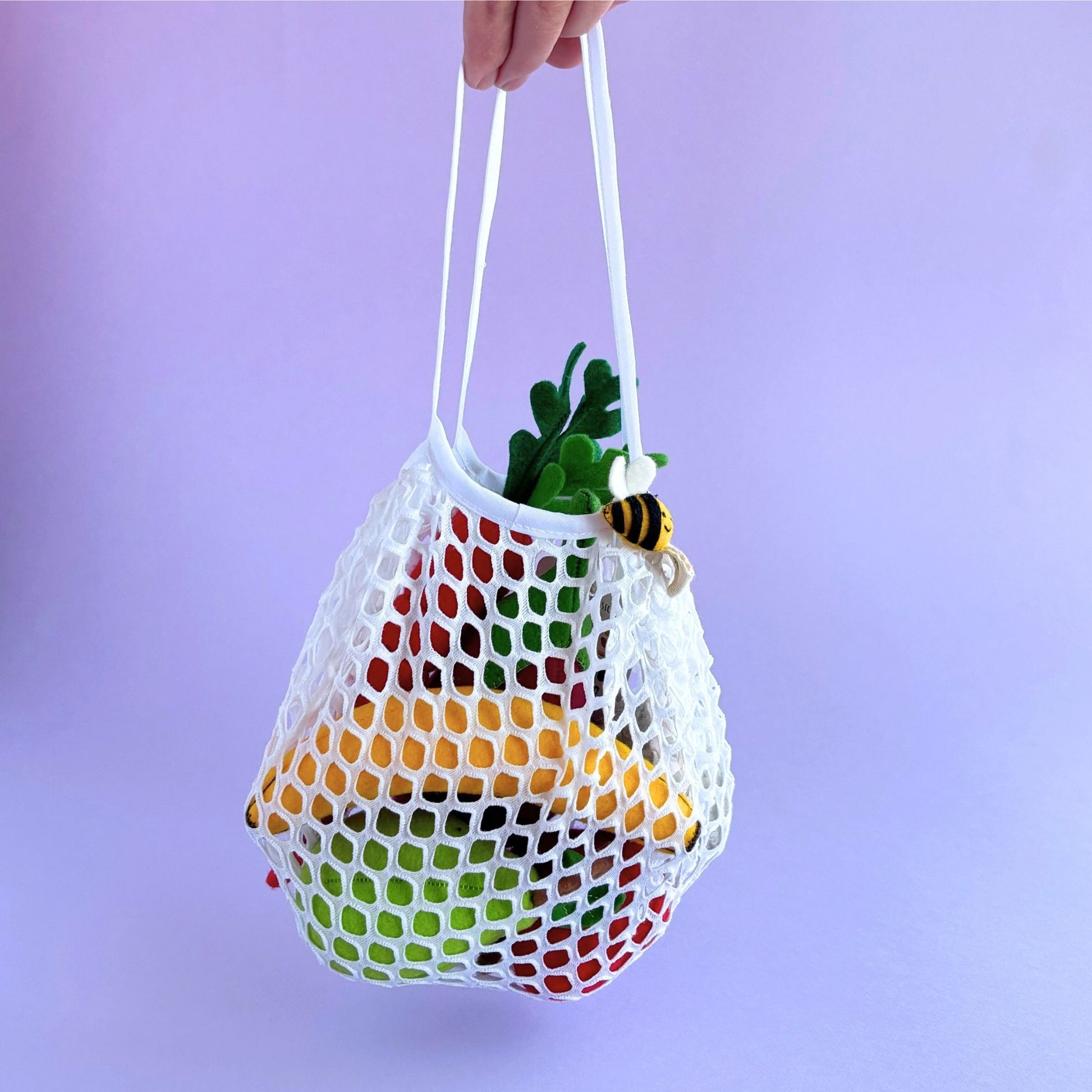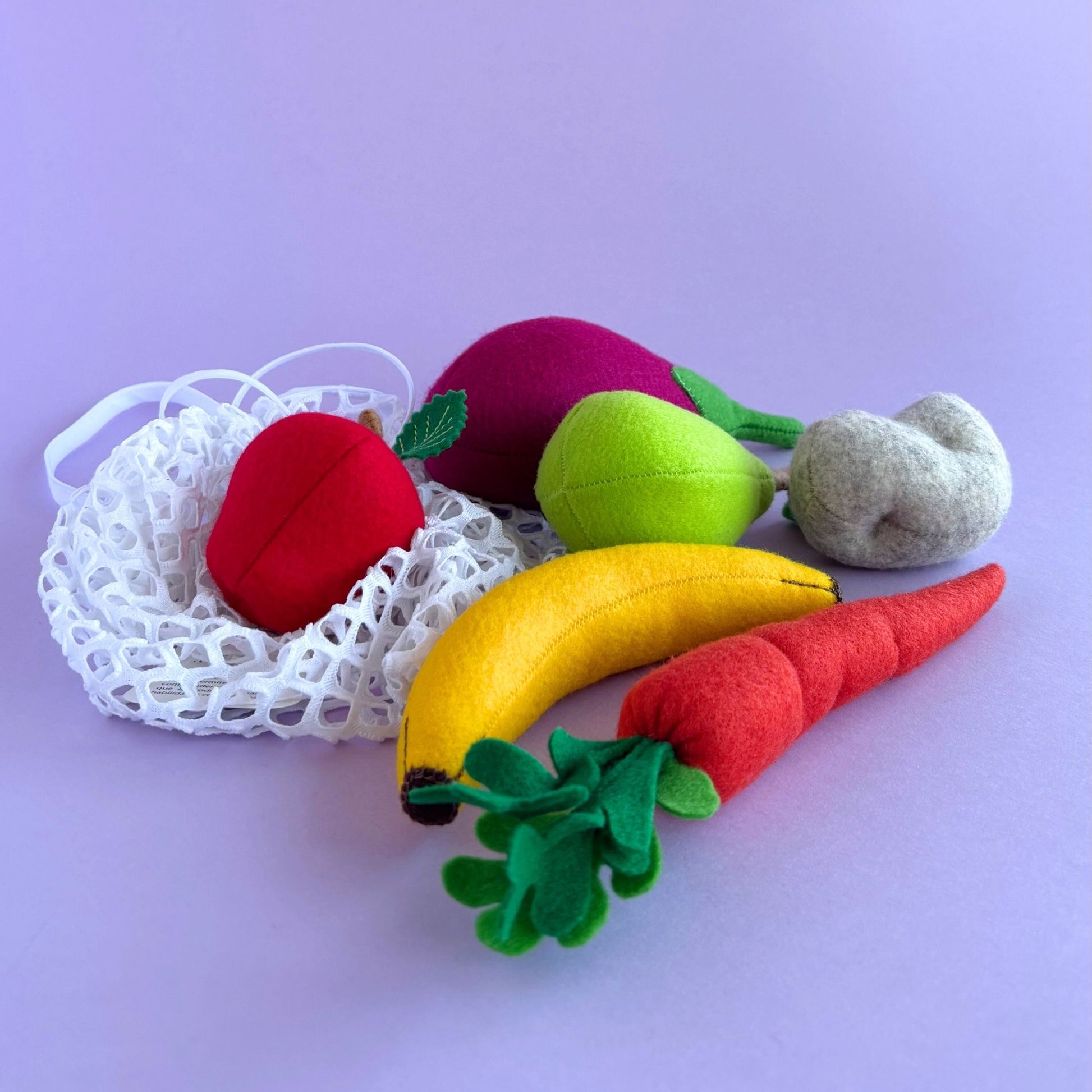 Un set encantador de frutas y verduras de fieltro suave, ideal para jugar, imaginar y aprender. Incluye papa, zanahoria, banano, manzana, pera y berenjena, todo dentro de su bolsita ecológica reutilizable.