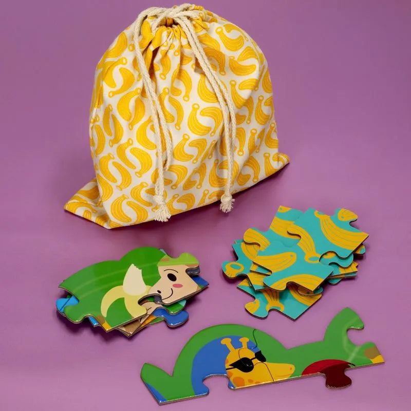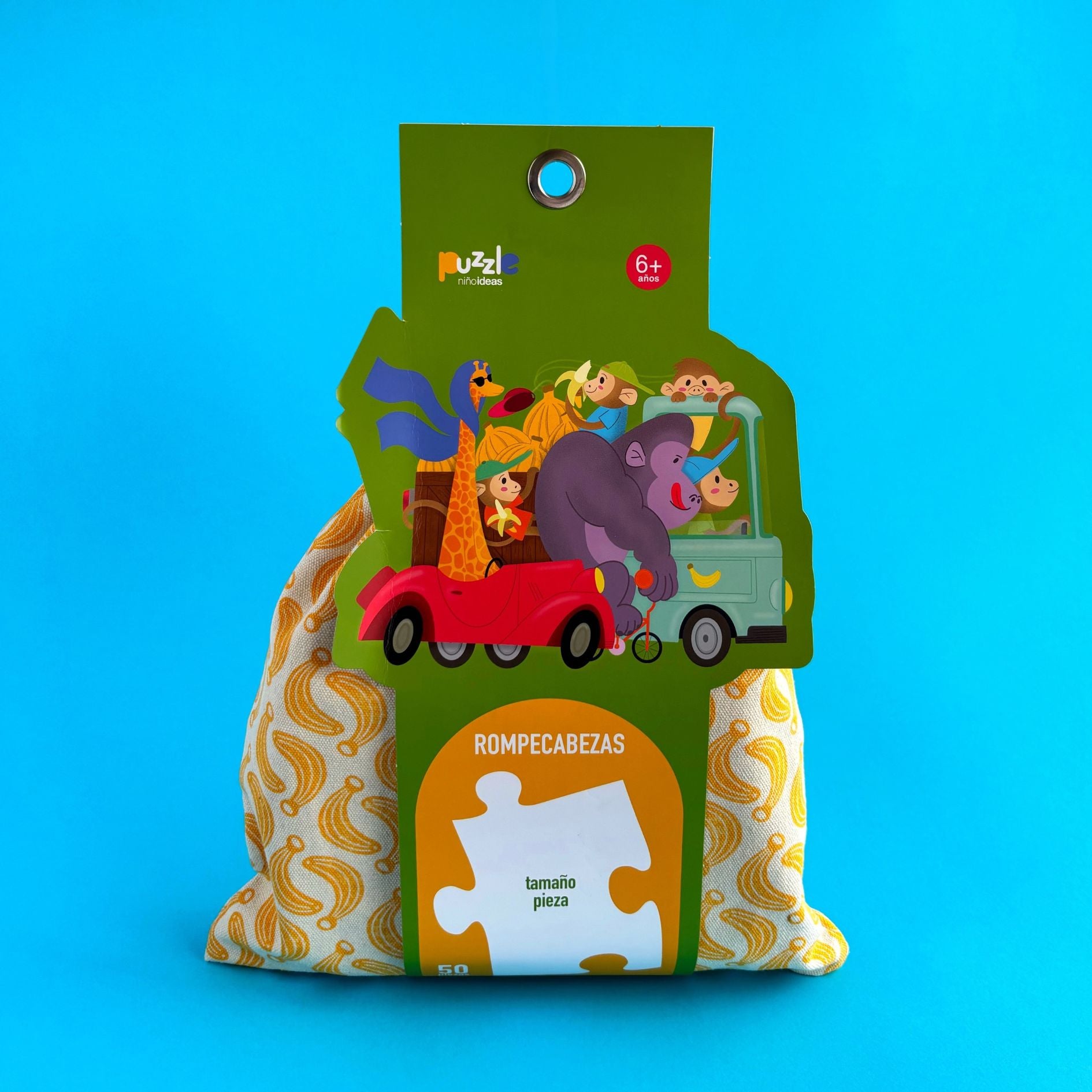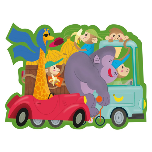 Este colorido rompecabezas muestra a un gorila y una jirafa viajando en un carro, mientras varios monos traviesos conducen un camión repleto de bananos. Con piezas grandes y resistentes, es perfecto para que niños y niñas desarrollen la concentración y la observación mientras disfrutan de un momento de juego fuera de las pantallas